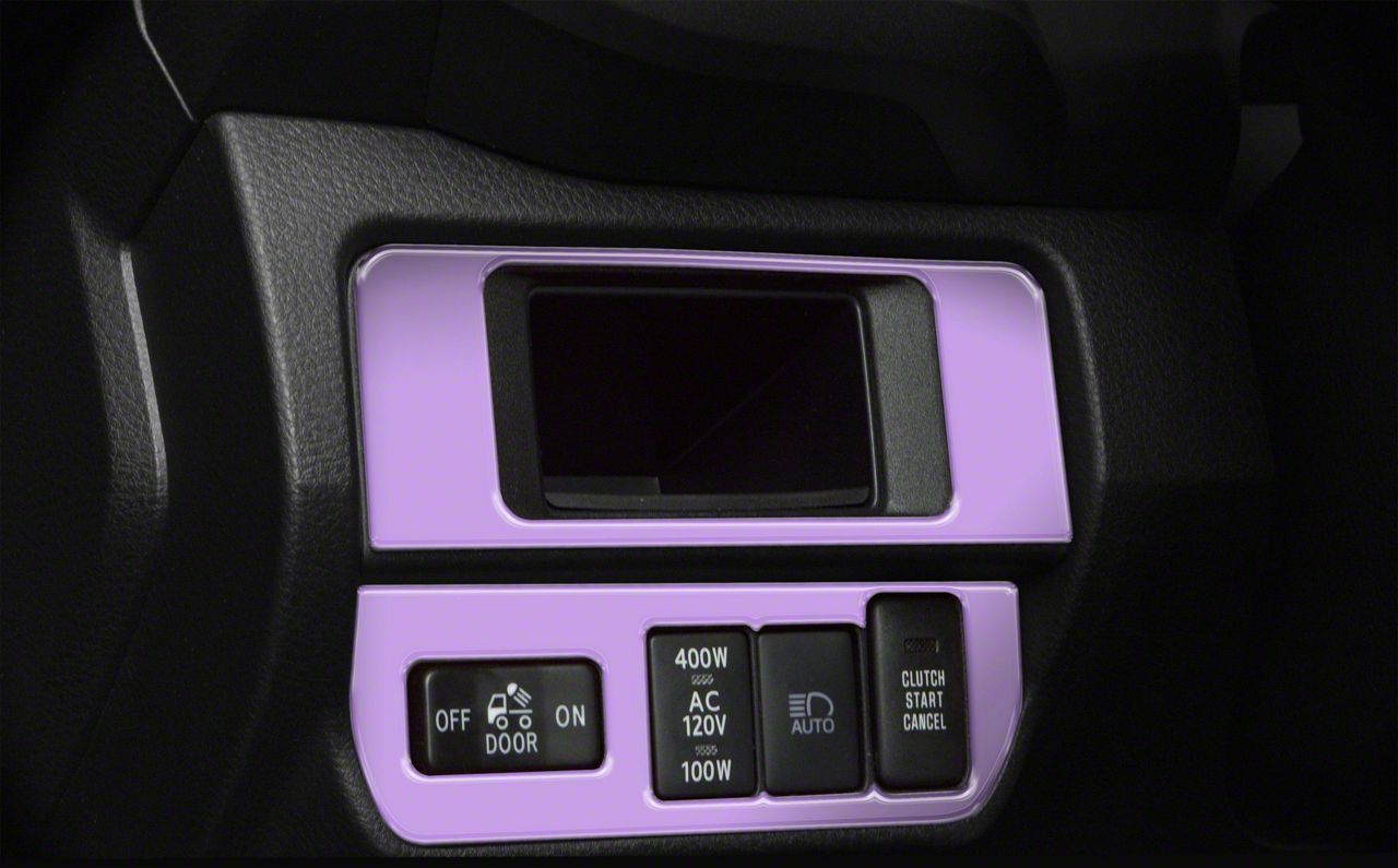 Stylish Interior Upgrade. The Dim Light 4-Switch Control Accent Trim gives your Tacoma's cabin a pop of color and a personalized touch. Finished in a vibrant lavender purple, this trim piece enhances the factory 4-switch panel area, adding visual appeal while preserving OEM styling. It's an ideal choice for drivers who want to add flair without overhauling the interior.