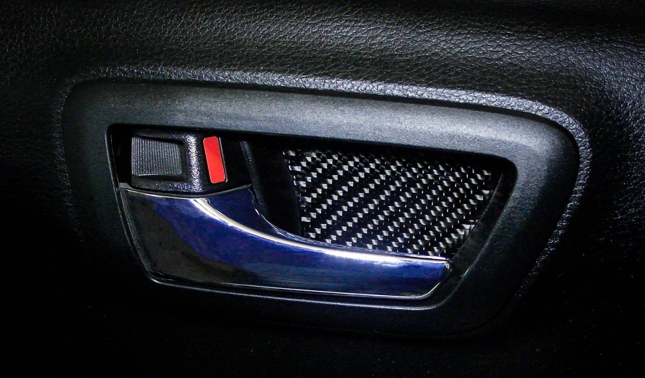 Construction and Appearance. These Door Handle Insert Accent Trim pieces undergo a 3-layer construction process. The first layer consists of UV doming resin that gives you a durable finish. Next, is a layer of mix of substrates that helps get you the specific color. Finally, there's a layer of 3M tape for a perfect fit. These pieces have a domed carbon fiber appearance.