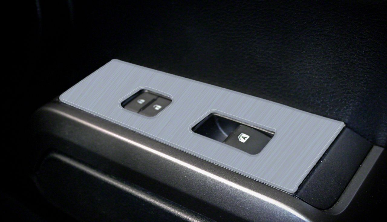 Construction and Appearance. This Door Switch Panel Accent Trim undergoes a 3-layer construction. First up is a UV-doming resin that gives you a high-gloss, durable finish. Next is a mixture of substrates that allows for custom colorization. Finally, it's 3M adhesive to make the installation snug and perfect. These pieces have a brushed silver appearance.