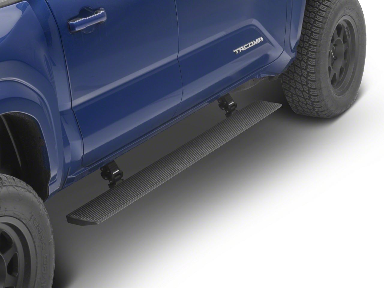 Advanced Accessibility. The Running Boards offer an unparalleled blend of functionality and style for your 2024-2026 Tacoma Double Cab. These powered models feature automatic deployment and retraction, ensuring ease of access while maintaining a sleek profile when not in use. Crafted from durable aluminum with a matte black finish, these boards are not only aesthetically pleasing but also robust and lightweight.