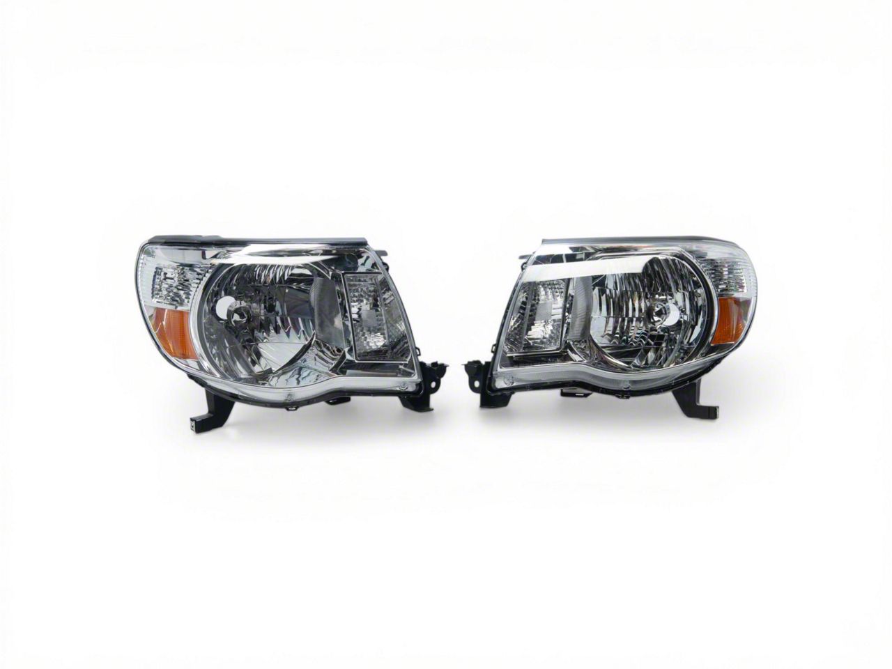 Stock-Style Headlights with Amber Corners for a Seamless Replacement. These Headlights are designed as a direct replacement for your 2005-2011 Toyota Tacoma, featuring amber corners and a polished chrome finish. With a clear transparent lens and a stock-style design, they ensure enhanced visibility while maintaining the original appearance of your vehicle.