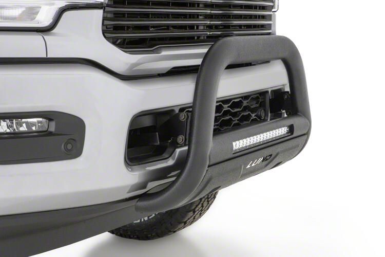 Bold Appearance. Lund Bull Bar with LED Light Bar is made from 3.5-Inch steel tubing in textured black finish for a rugged appearance and excellent durability. The steel skid plate features a flood beam pattern light bar and is adorned with a glossy version of the brand’s logo.