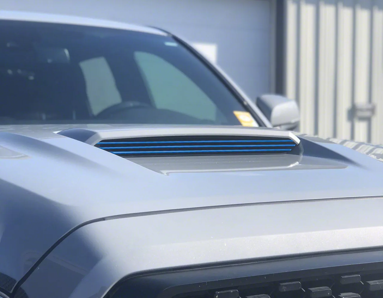 Stylish Performance Aesthetic. The Inner Hood Scoop Line Accent, engineered for all 2016-2023 Tacoma models, offers an effortless way to enhance your vehicle's aesthetic appeal. This accessory is proudly made in the USA and features a domed material construction for durability and a sleek appearance. The voodoo blue finish provides a striking contrast or complement to your Tacoma's existing color scheme, adding a touch of customization and visual interest to the vehicle's front profile.