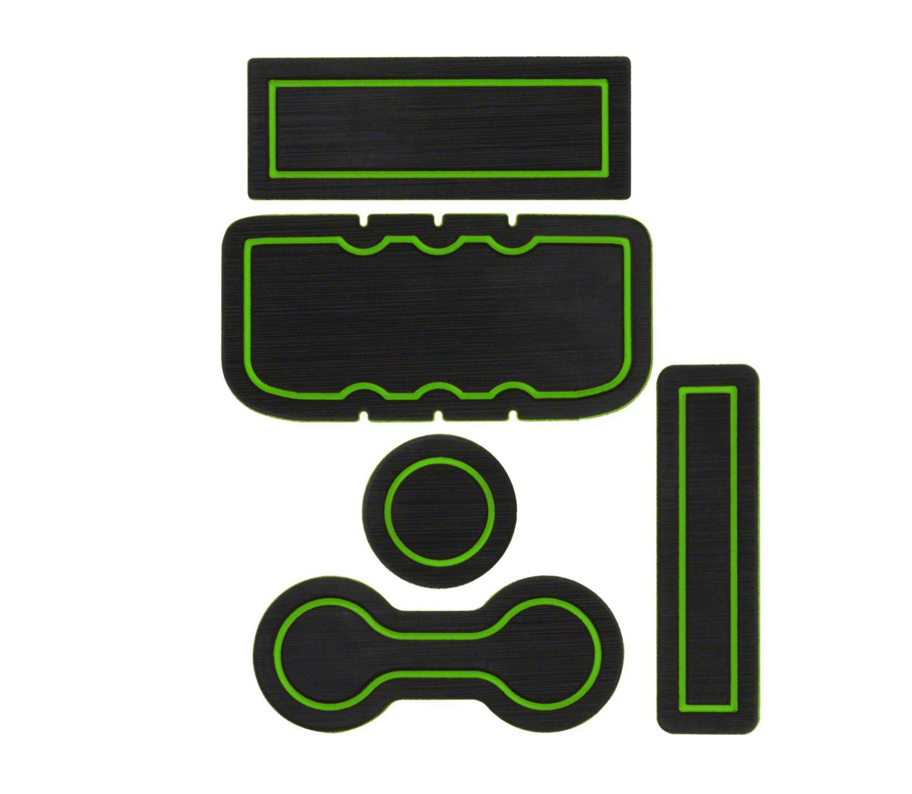 Construction and Appearance. These Interior Cup Holder Foam Inserts, which were made in the USA, were constructed from non-absorbent, non-skid foam. The 5 pieces come in black with green trim.