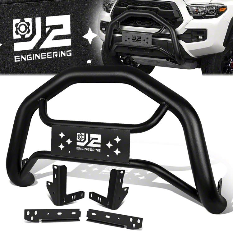 Rugged Protection. The Bull Bar is crafted to offer robust front-end protection for your Tacoma. Made from high-grade steel tubing with a black powder-coat finish, it is designed to withstand harsh conditions while preventing rust and corrosion. This accessory not only safeguards your vehicle against impacts but also enhances its off-road appearance.
