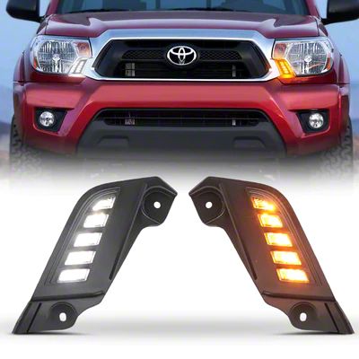 Enhanced Daytime Visibility. The switchback white daytime running lights enhance visibility during the day, while the integrated 3-second amber sequential turn signals offer clear signaling for safer turns. The lights are stylishly housed in a smoked lens with ABS housing, adding a modern, sophisticated look to your Tacoma.