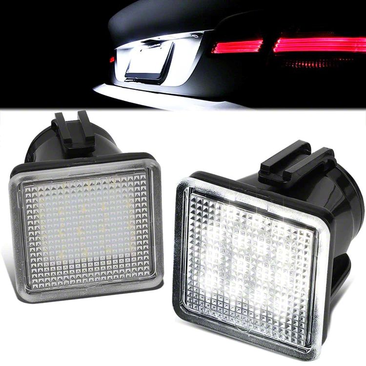 Bright LED License Plate Lights. The LED License Plate Lights are designed to provide a clear white output, enhancing the visibility and appearance of your license plate. Featuring a matte black finish ABS plastic housing and clear transparent lens, these lights offer a sleek and modern look for your vehicle. They are a perfect upgrade to replace the stock halogen bulbs, ensuring better illumination and style.