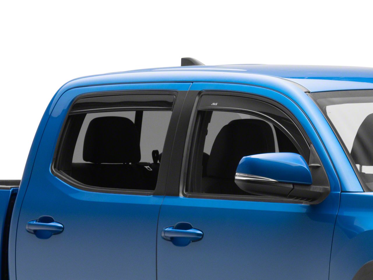 Application. These Low Profile Ventvisor Front & Rear Side Window Deflectors in Dark Smoke fit all 2016-2023 Toyota Tacoma Double Cab models.