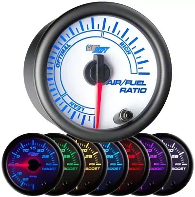 GlowShift’s White 7 Color Series Narrowband Air/Fuel Ratio Gauge allows you to monitor your engines air to fuel mixture, ensuring it is at optimal levels, resulting in reduced emissions and better fuel economy. This gauge will give you a good estimate of your vehicle’s air/fuel mixture, but if you are looking to really tune your vehicle we recommend purchasing GlowShift’s Wideband Air/Fuel Ratio Gauge. This narrowband air to fuel ratio gauge is easily installed with the included color coded wire harness that lets you connect the gauge directly to your vehicles existing narrowband oxygen sensor. GlowShift’s narrowband air/fuel gauge includes some incredible features like stepper motor technology, 7 color through dial lighting, an easy to read magnified lens, as well as an illuminated red needle that will sweep 270 degrees. The included stepper motor gives this gauge the perfect combination of smooth needle movement along with incredibly accurate readings, and GlowShift’s 7 Color through dial lighting allows you to select from 7 different solid color modes or 2 color cycle modes, letting you to match your factory dash lights or add a custom look to the interior of your vehicle. This air/fuel ratio gauge will also dim 30% for easier night time driving by simply connecting it to your factory headlight switch, and with the color memory recall feature you don’t need to worry about adjusting the color of your gauge every time you turn your vehicle on. GlowShift stands behind all of its products by including free lifetime technical support and a one year limited warranty with every gauge purchase.