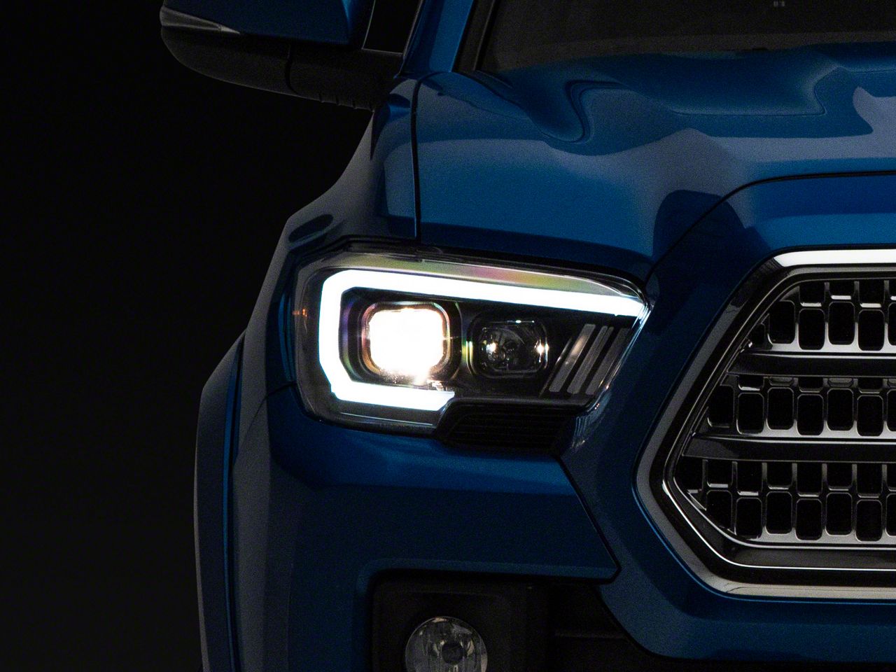 Application. This pair of Plank Style Switchback Black Projector Headlights is specifically designed to be used on all 2016-2023 Toyota Tacoma models with Factory Halogen Headlight and LED DRLs.