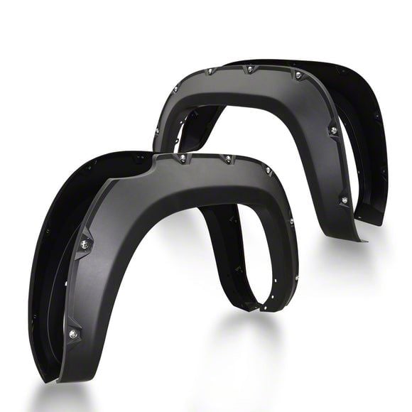 SURFACE FINISH - Matte black light textured finish. Distinctive pocket design with customer decorative chrome rivet.OUTSTANDING DESIGN - Injection molded for improved fit and finish over vacuum forming. Durable and UV stable under all weather conditions. Practical and economical way to protect your truck from mud, rocks, and debris especially when installing aftermarket tires and wheels.EASY TO INSTALL - Easy Installation. No drilling and cutting required. All mounting hardware and Installation instruction included.