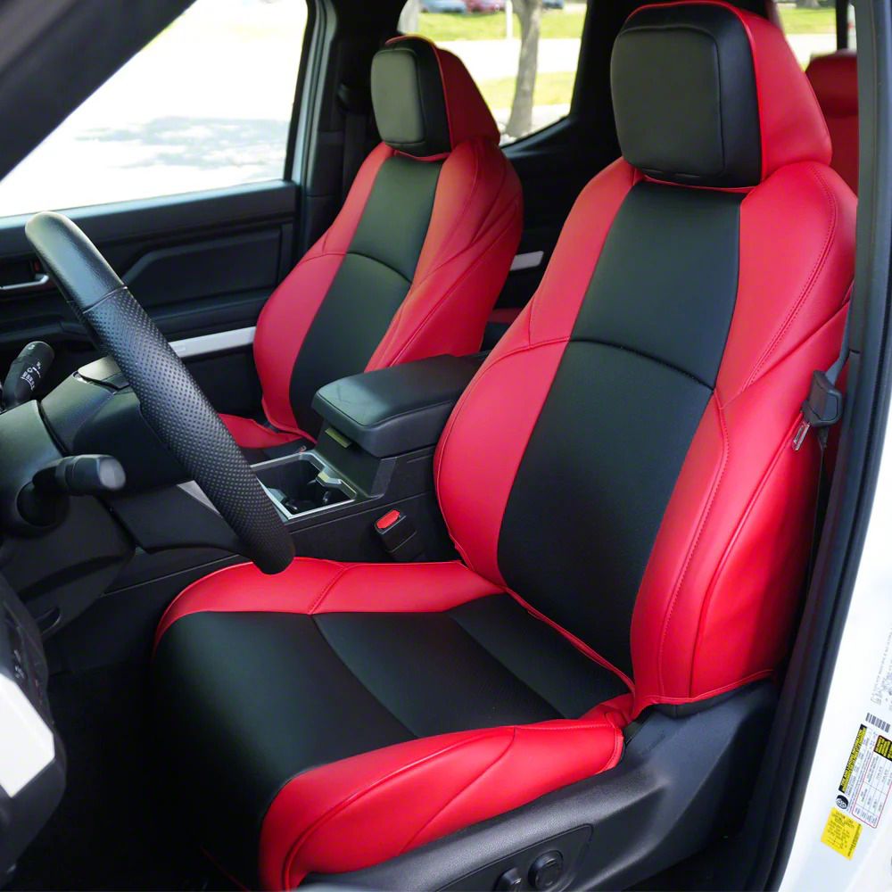 Construction and Appearance. Crafted from premium artificial leather, these seat covers offer a soft-touch feel with long-lasting durability. The custom-fit design ensures full coverage and a snug fit that won't shift during use. Easy-to-clean surfaces make maintenance simple, while the black-and-red color scheme enhances the truck's sporty interior aesthetic.