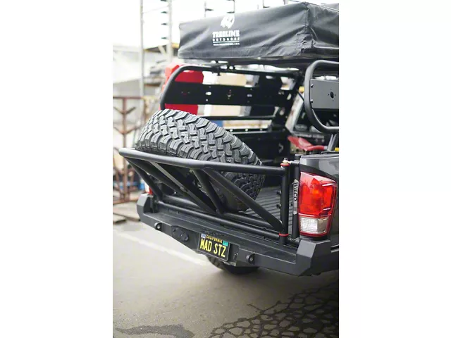 PreRunner Tiregate. Are you concerned about the safety of your spare tire? The PreRunner Tiregate is here for you. It's capable of storing up to 40-Inch tire and allows even allows you to easily open and fully access the truck bed. It has a double latch pin to increase security and safety.