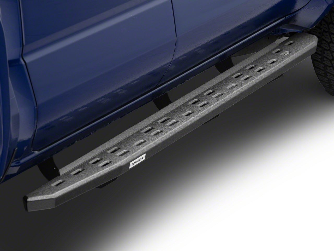 Stylish and Functional. The Go Rhino RB30 Slim Line Running Boards provide a sleek, low-profile design inspired by the Ford Raptor. These running boards offer a wide stepping surface with flow-through slots, ensuring both style and functionality for your 2024-2026 Tacoma Double Cab.