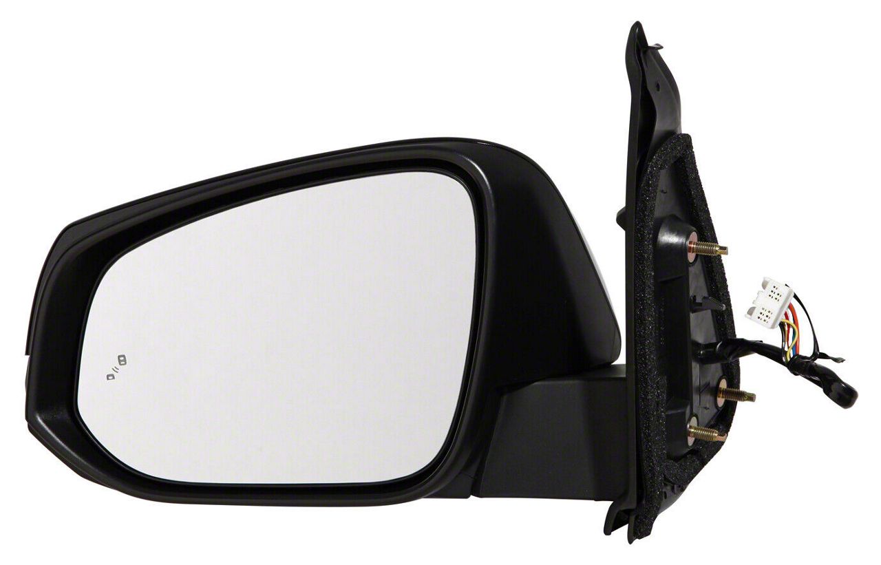 Reliable Performance. Upgrade the functionality and safety of your Tacoma with the Replacement Powered Heated Side Door Mirror with Blind Spot and Turn Signal; Driver Side. Equipped with a powered adjustment mechanism, this mirror allows for convenient positioning from inside the cabin, ensuring you always have the perfect view of your surroundings. The heated mirror surface is a crucial feature for those frosty mornings, eliminating ice and fog buildup to maintain clear visibility. the blind spot detection alerts you to vehicles in your blind spot, reducing the risk of accidents during lane changes. Additionally, the integrated turn signal enhances your visibility to other drivers, further improving road safety.