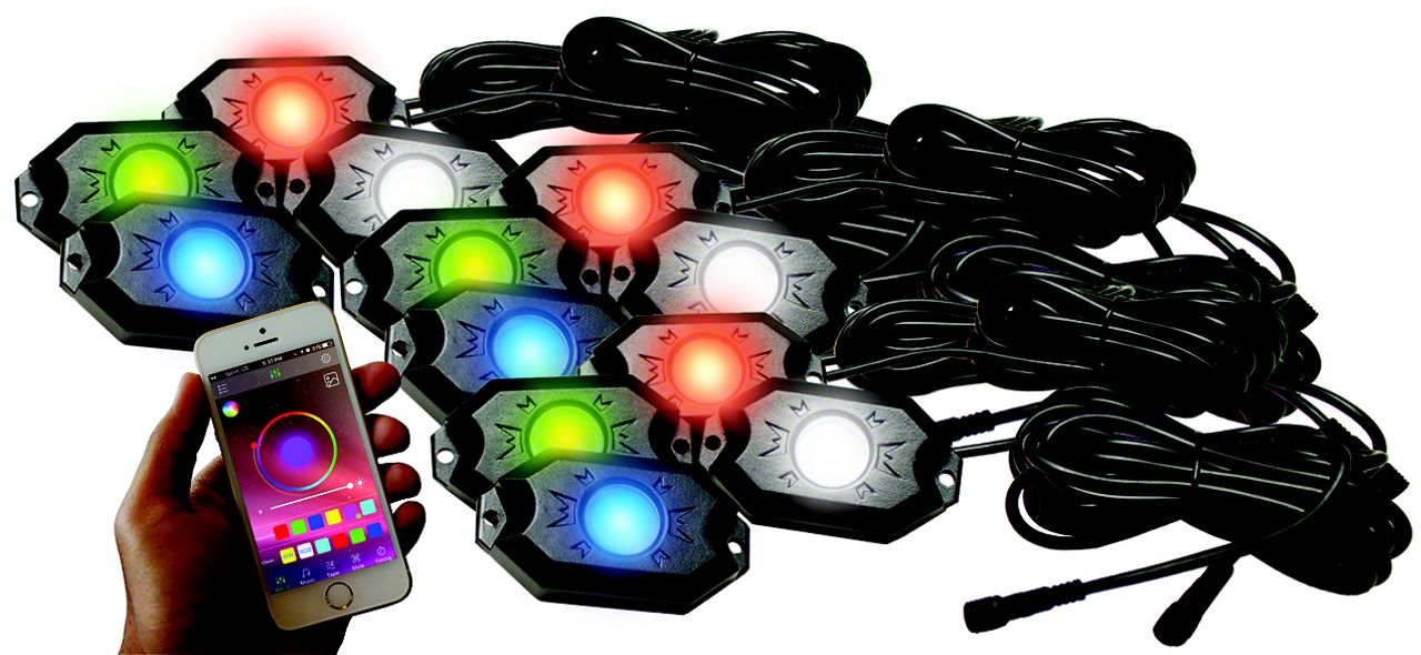 Vibrant Underglow Illumination. These Rock Lights provide brilliant, customizable lighting to enhance your vehicle’s style and visibility. Featuring a high-power RGBW output, this 12-pod set delivers a wide range of vibrant colors controlled via a Bluetooth app. Whether you're off-roading at night or adding a unique glow to your vehicle, these lights ensure eye-catching illumination and functionality.