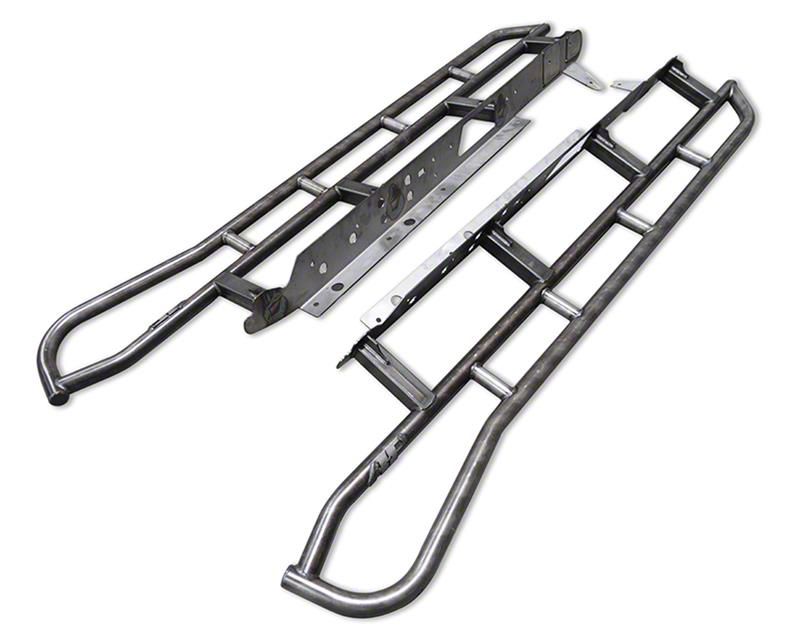 Durable Terrain Protection. Crawl through rugged terrain and fear no obstacle with this Rock Sliders; Bare Steel on your Tacoma. Sporting a tough structure, this kit features a bold design appropriate for terrain travel with higher clearance compared to traditional running boards. It features a bold structure that is tough and made from steel. It is unpainted and ready to be painted to match the style and look of your vehicle.