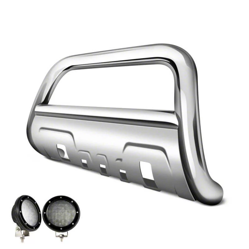 Construction and Appearance. This bull bar is crafted from 3.50-inch oval tube stainless steel with mandrel-bent tubing for superior strength. Its polished mirror-like finish resists rust and corrosion, ensuring a long-lasting, premium appearance. It also features a removable skid plate for added utility and protection.