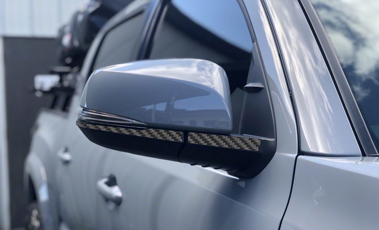 Application. The Side Mirror Accent Trim that comes in Raw Carbon Fiber is dedicated to fit on all the 2016-2023 Toyota Tacoma Models, with Mirror Blinkers.