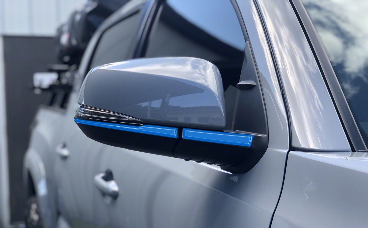 Application. The Voodoo Blue Side Mirror Accent Trim fits any 2016-2023 Toyota Tacoma model.