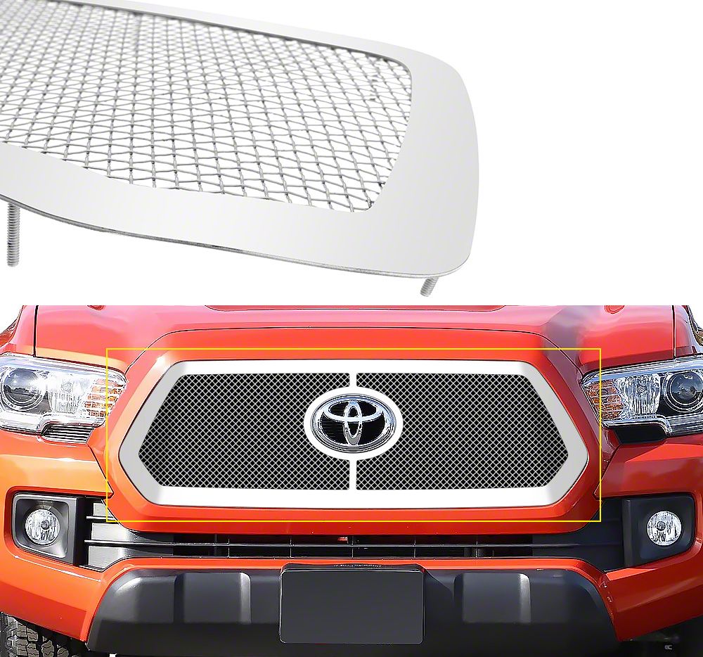 Stylish and Durable Grille Upgrade. The Upper Grille Insert is a sleek and functional enhancement for your 2018-2019 Toyota Tacoma with a TSS sensor. Designed with a polished chrome finish and a wire mesh pattern, this grille insert adds a modern and aggressive look to your truck while maintaining airflow and sensor functionality.