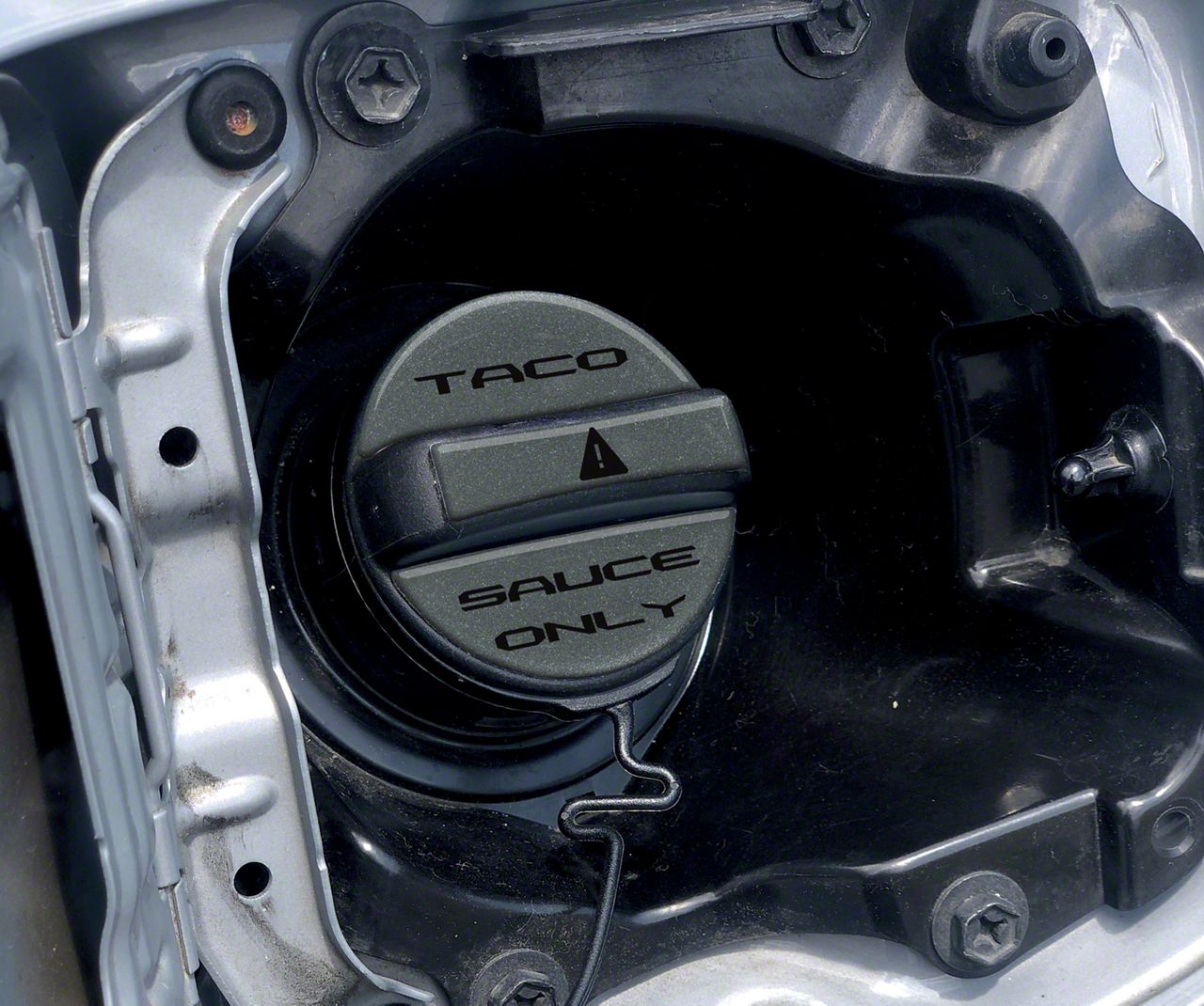 Taco Seasoning. Spruce up under your hood with this Taco Sauce Only Fuel Cap Overlay; Magnetic Gray Metallic with Black Text. This 3-piece kit will provide you some protection and style on your Tacoma's gas cap lid, a spot long forgotten when it comes to appearance upgrades.