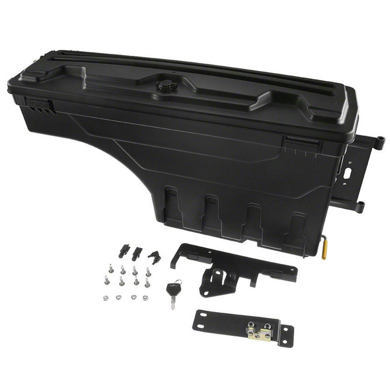 Convenient Storage Solution. The Truck Bed Swing-Out Storage Box is engineered to maximize cargo organization while maintaining easy access. This product is mounted on the passenger side, giving drivers a practical way to store tools, gear, or small equipment. With its unique swing-out design, it helps prevent clutter and keeps essentials safe during travel, ensuring a more efficient use of your truck bed.