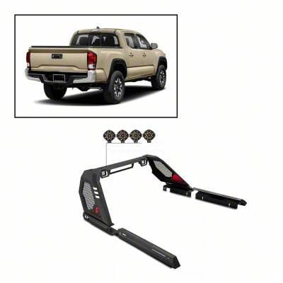 Stylish Cargo Bed Support. Elevate your Tacoma's style and functionality with the Vigor Roll Bar with 7-Inch Black Round LED Lights and LED Cube Lights; Black. Crafted for a perfect fit, it adds a rugged and modern touch to your vehicle's exterior. It comes equipped with 7-inch black round LED lights and LED cube lights. These high-powered LEDs illuminate the road ahead, providing enhanced visibility in low-light conditions and making your truck stand out.