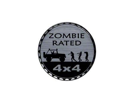 Appearance. This circular badge features "ZOMBIE RATED" in black with an etching of a Jeep and 3 zombies staggering, also in black. They have a silver backing, while "4x4" is etched in silver below the panorama with a black backing.
