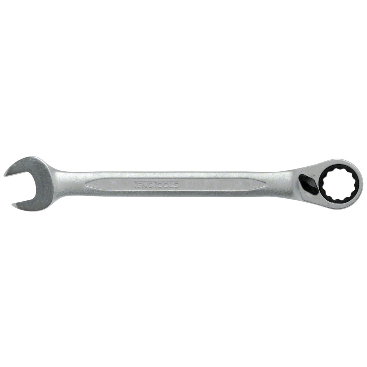 Combined ring/open ended spanner with 72 teeth and a 12 point ring ratchet with flip reverse. The 12 point ratcheting ring end is offset at a 13 degrees angle. Same size at both ends. Made from chrome vanadium with a satin finish)