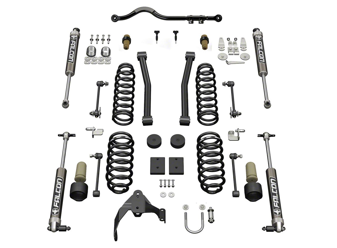 Complete Suspension Kit. For a convenient upgrade, this suspension lift kit includes all the components necessary for the build. Both the included Falcon shocks and Teraflex coil springs are designed to improve compression and optimal vehicle stability. Alignment will also be not necessary after installation because of the flexarms, adjustable front track bar, and rear track bar. All these are designed to optimize and correct caster and pinion angles for the 2.5-inch lifted height. It is indeed a package that includes everything you need for a complete setup.