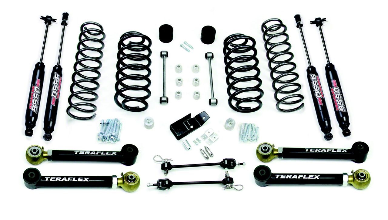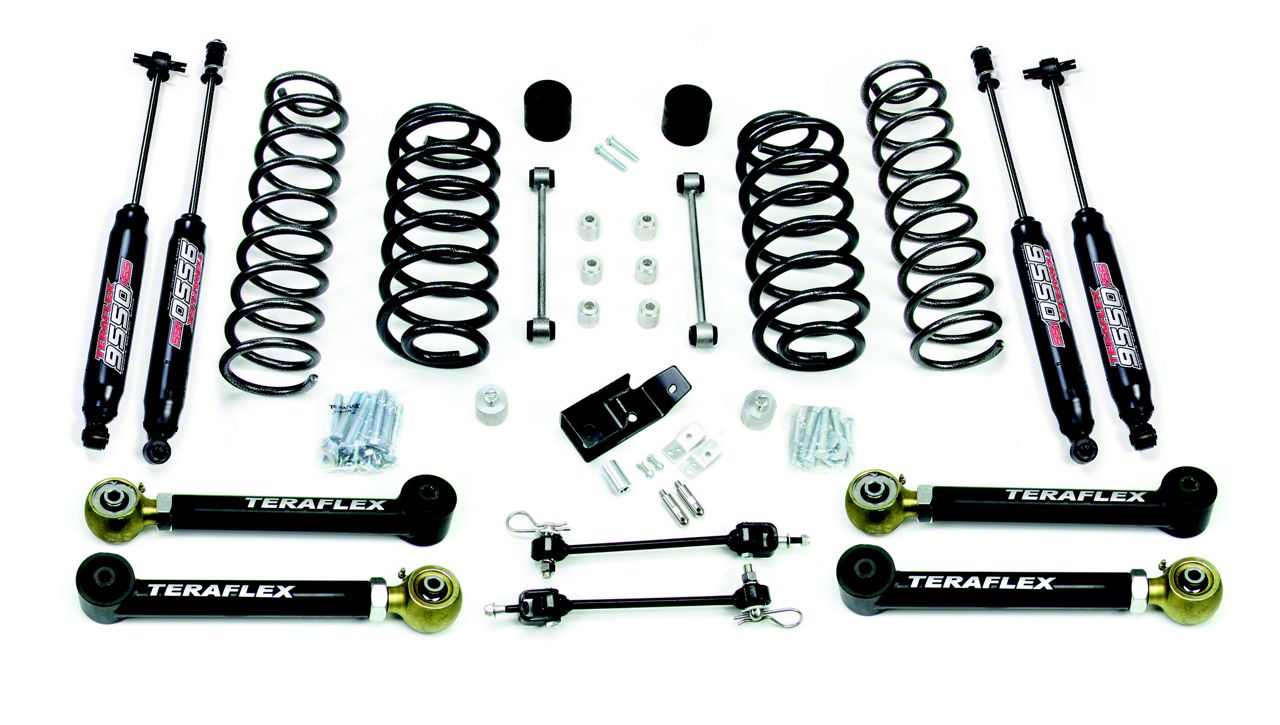 Improved Off-Road Experience. Let your powerful TJ conquer the challenging terrains with confidence by using the Teraflex 3-Inch Lift Kit with Shocks & FlexArms. This kit equips your TJ so that you can crawl over rocky trails and rugged substrate with better handling and improved ride quality. It accommodates tires up to 33 inches and includes a full set of shocks, coil springs, sway bar links and quick disconnects, and adjustable control arms.