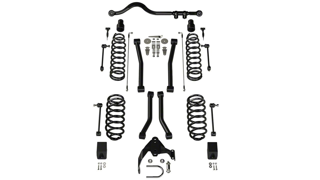 Adjustable Control Arms. This suspension kit comes with four preset Sports FlexArms for a precise axle and wheel placement. This means that when hitting the trails, the axle flex is not restricted, and you can crawl your way out of tough trail situations. It also comes with a forged front track bar to battle side to side movement on the trails or on the streets. You need to use factory style rubber bushings to reduce the harshness delivered from the ground up.