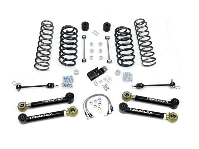 Kit Contents. The TeraFlex 4-inch lift kit includes springs, extended stainless steel brake lines, rear sway bar links, bump stops, and a rear track bar bracket.