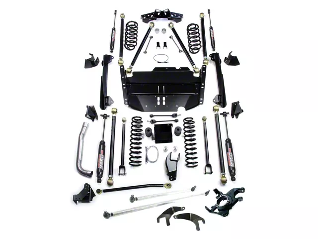 Upgrades 5-Link Suspension. This Travelex Pro LCG Lift Kit comes with TeraFlex 9550 VSS Shocks and a TJ LCG High Steer Kit. The upgrade replaces your Wrangler TJ's 5-link suspension with a triangulated 4-link truss, thus eliminating the rear track bar. Sturdy coil springs provide a 5 inch lift and you can adjust anti-squat with the included rear upper brackets for the exact desired suspension. Up front, the new upper long flex arms are a whopping 9 inches longer than stock. The super-strong lower flex arms are made of heavy-duty 1-3/4 inch x 0.281-wall DOM tubing.