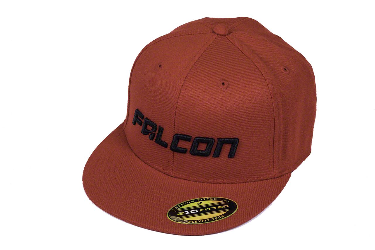 Falcon Logo Hat. This great looking red, flat bill, Flexfit baseball cap with matching red stitching features the Falcon Shocks text logo superbly embroidered in black on the front and the Falcon graphic embroidered on the back. This Falcon themed Hat is the perfect piece of attire to show off your love for Teraflex's Falcon brand shocks, no matter where your travels may take you.