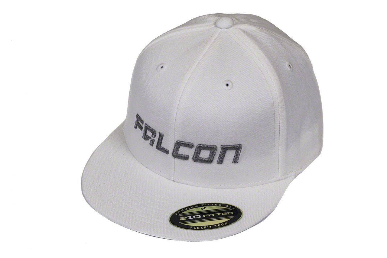Falcon Logo Hat. This great looking white, flat bill, Flexfit baseball cap with matching white stitching features the Falcon Shocks text logo superbly embroidered in gray on the front and the Falcon graphic embroidered on the back. This Falcon themed Hat is the perfect piece of attire to show off your love for Teraflex's Falcon brand shocks, no matter where your travels may take you.