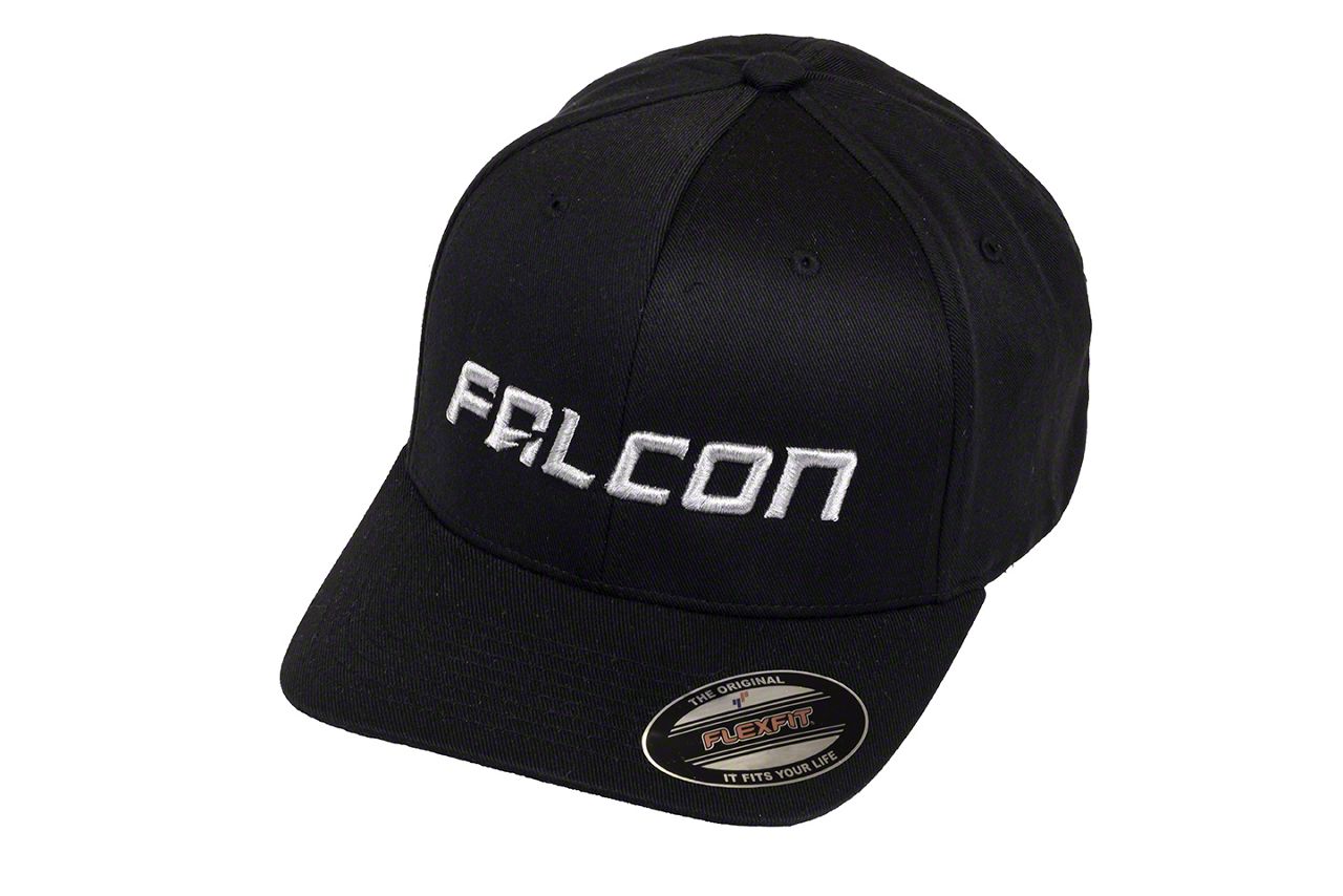 Falcon Logo Hat. This great looking black Flexfit baseball cap with matching black stitching features the Falcon Shocks text logo superbly embroidered in white on the front and the Falcon graphic embroidered on the back. This Falcon themed Hat is the perfect piece of attire to show off your love for Teraflex's Falcon brand shocks, no matter where your travels may take you.