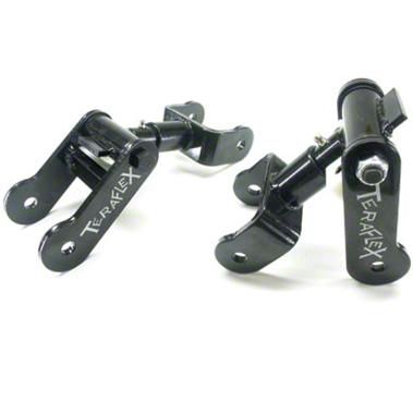 Construction. The design of these front revolver shackles allows the leaf springs to compress and move without receiving additional stress. TeraFlex's shackles fold against themselves on level ground and will also increase articulation and wheel droop so your Jeep gives you the best possible performance.