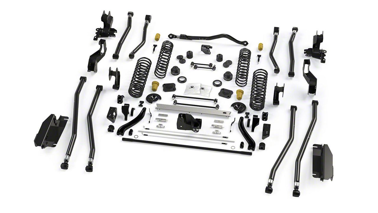 Construction and Appearance. This suspension kit features a combination of matte black and glossy black finishes that offer a sleek, rugged appearance while resisting corrosion and wear. Engineered with high-strength components, it includes durable long arms, coil springs, and heavy-duty tie rods, all built for long-lasting use in extreme terrain conditions. The precision construction ensures optimal suspension geometry and handling.