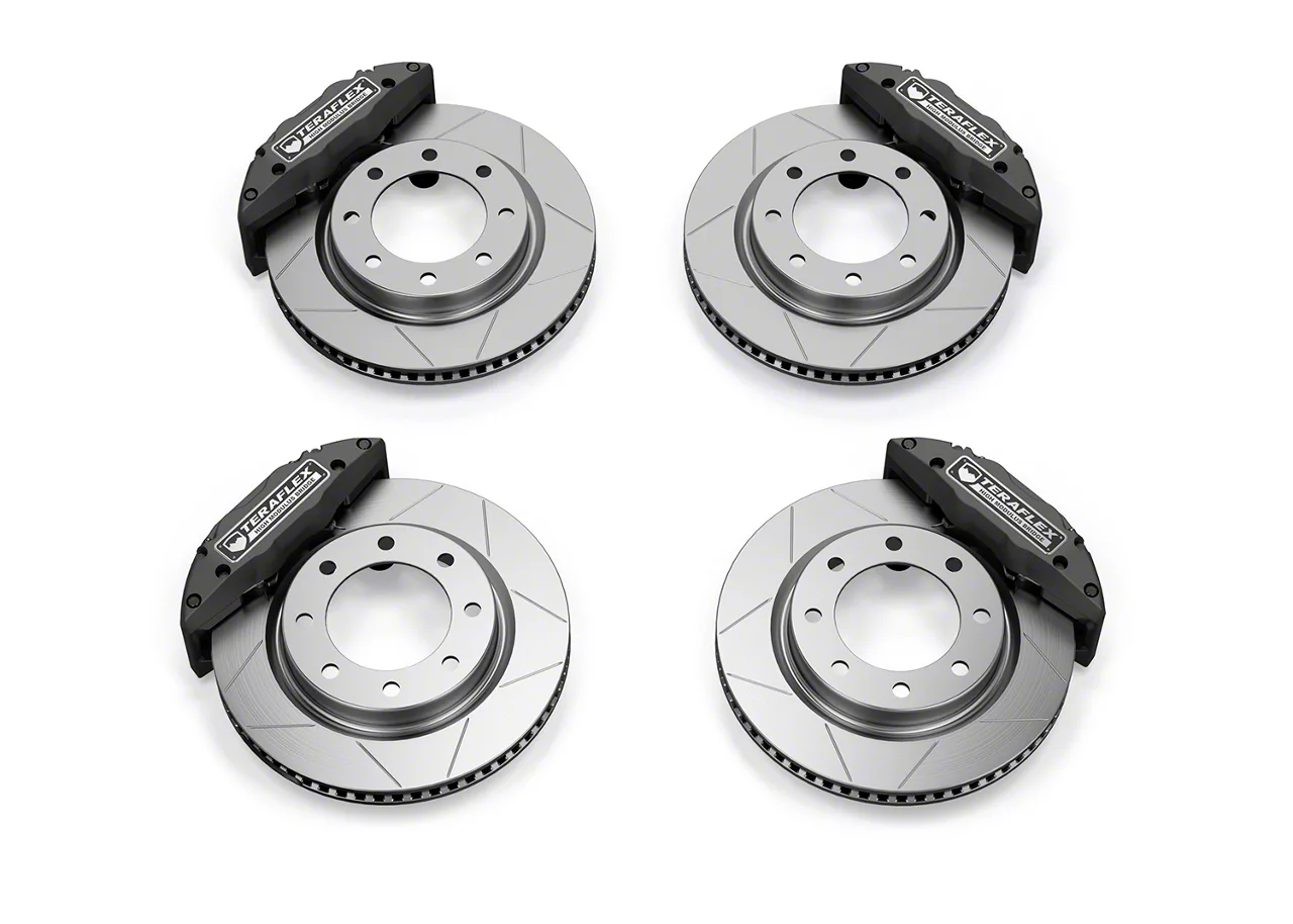 The Complete Kit. The kits include large cast iron rotors that have been slotted and vented and GEOMET-coated for a long-lasting finish. The calipers are made of cast steel and the brake pads are composite resin and semi-metallic. All necessary hardware has been included to aid in a successful upgrade.