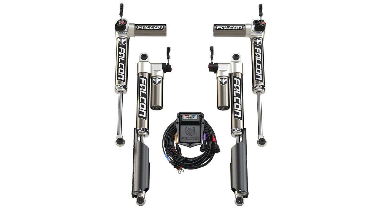 Premium Construction. To handle your truck’s rugged off-road drives, these front and rear Falcon shocks are built using premium-quality components. Each shock is crafted with an aluminum alloy shock body and sports a hardened chrome-plated shaft to protect against the damaging effects of road debris and corrosive elements. Furthermore, these shocks have a piggyback design, allowing them to offer increased oil and gas capacity for reduced heat.