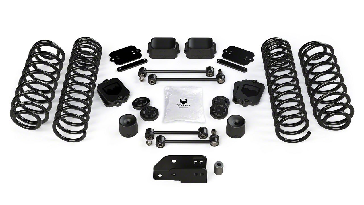 Less Wobble and Bobble. The Teraflex 2.50-Inch Base Suspension Lift Kit comes with 2 front and rear coils, a sway bar link, and bump stops that reduce the swaying and bouncing that you would normally get from driving in new and rugged terrain. Say no more to turbulent travels and enjoy smooth off-road sailing.