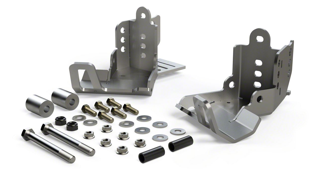 Versatile Mounting. This skid plate kit is designed to allow 3 shock mounting locations. Level 1: lower shock mount at stock shock mount height; Level 2: lower shock mount 0.8 in. higher than stock; or Level 3: lower shock mount 1.6 in. higher than stock.