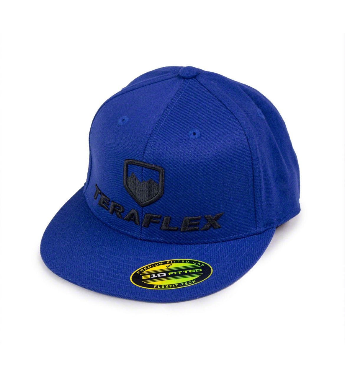 Teraflex Logo Hat. This great looking royal blue, flat bill, Flexfit baseball cap with matching blue stitching features the Teraflex text logo superbly embroidered in black on the front and the Teraflex emblem embroidered on the back. This Teraflex themed Hat is the perfect piece of attire to show off your love for the Teraflex brand, no matter where your travels may take you.