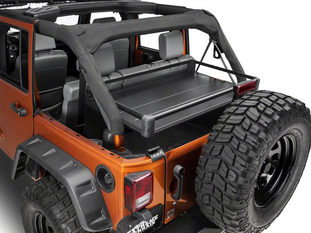 Installation. Designed to offer lots of added space and storage for your hard top JK 4-door, this Cargo Rack comes with black powdercoated floor panels and black aluminum side rails, along with all necessary hardware for installation. Any load will be supported and carried by your factory sport bar for a safe and secure upgrade.