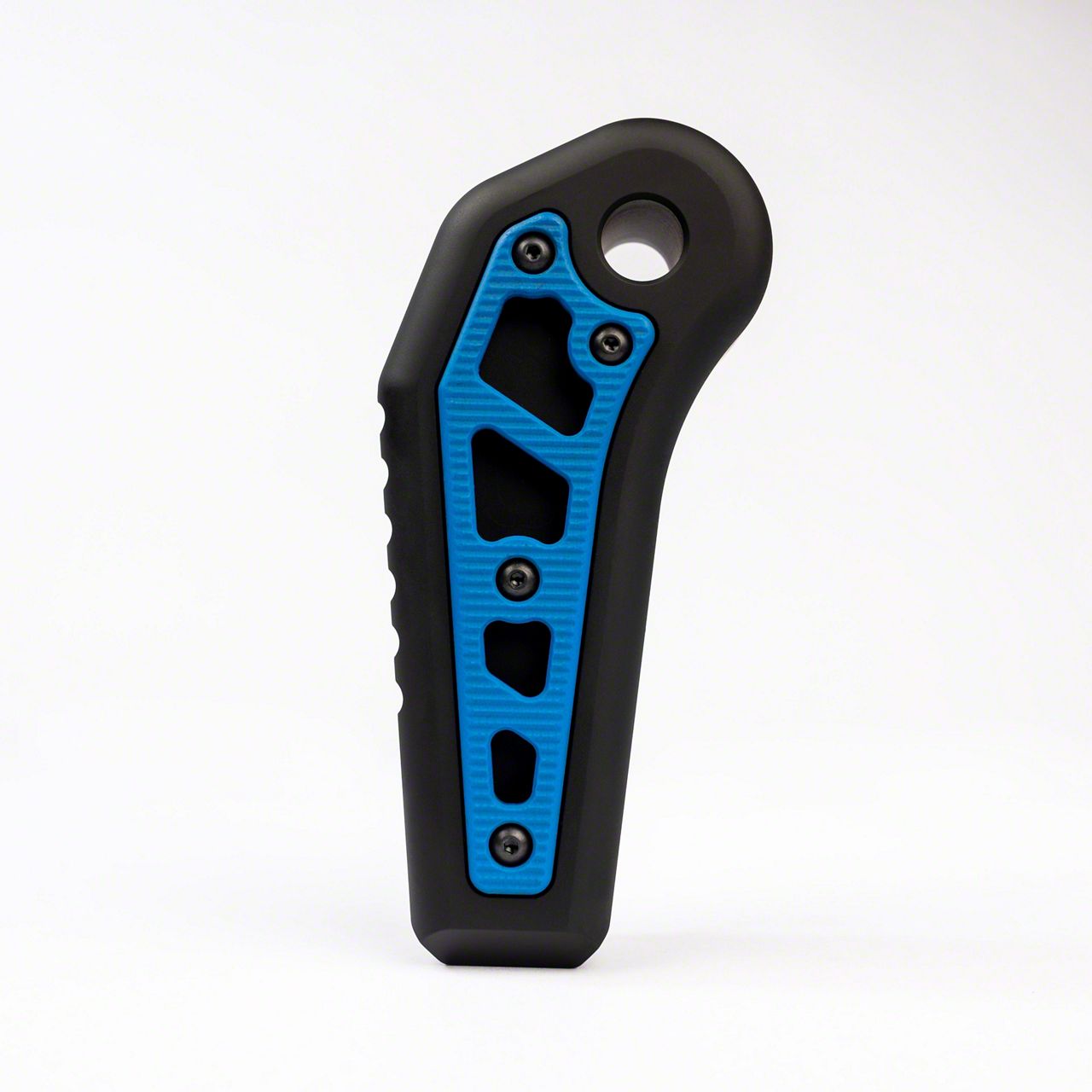 Construction and Appearance. Manufactured from premium-grade hard-anodized aluminum, this shift knob is built to last, featuring a CNC-machined composition and wrapped in a sleek Blue finish. What's more? The interchangeable colored G10 scales add a customizable touch to your Toyota Tacoma's interior.