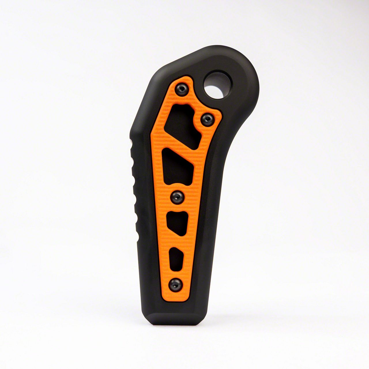 Construction and Appearance. Manufactured from premium-grade hard-anodized aluminum, this shift knob is built to last, featuring a CNC-machined composition and wrapped in a sleek matte Orange finish. What's more? The interchangeable colored G10 scales add a customizable touch to your Toyota Tundra's interior.