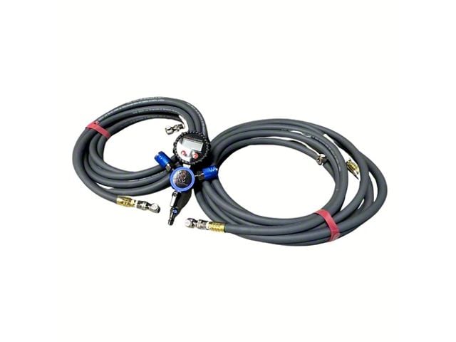 Description. The Thor’s Lightning Air System allows you to air up and deflate all four tires (at the same time!) on your Midsize Vehicles (Jeep Wrangler JK/JL/JT, Ford Bronco, Toyota 4Runner, Toyota Tacoma, Ford Ranger, etc.) This system will also work very well with Four-Seater Side-by-Sides. The system can be used from the front or rear of the vehicle. The system includes the Thor's hammer manifold (choose red, blue, or silver) with a digital gauge and quick disconnect STANDARD! The system utilizes high-diameter (3/8") hybrid rubber-PVC hose that works insanely well in cold temperatures, high-flow brass fittings, high-flow lock-on air chucks, and the incredible high-flow Lightning Fast Hammer Manifold. As a result, this is the FASTEST air system on the market. Other systems on the market use 1/4" diameter air hose, which restricts air flow- that's why we use the biggest and best! The Thor's Lightning Air System is the perfect companion for any air source- single or dual air compressors and PowerTanks. Once you manage the air pressure on all 4 tires at once, you'll never go back to the old fashioned way!