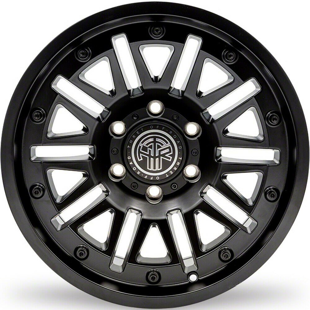 Thret Offroad Storm Satin Black 6-Lug Wheel; 18x9; -12mm Offset exudes sophistication with its finish, offering a sleek and modern appeal to any vehicle it adorns. The design is meticulously crafted to enhance the aesthetic of your vehicle, giving it a distinctive and upscale look. Perfect for those seeking to elevate their vehicle's style, this wheel blends seamlessly with both contemporary and classic vehicle designs, making it a versatile choice for a wide range of vehicles. Its robust construction ensures durability, making it a reliable choice for drivers who value both style and quality.